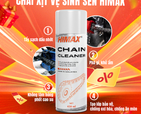 HIMAX Chain Cleaner là xịt vệ sinh chuyên dụng cho sên và mắt xích. Nó giúp loại bỏ dầu mỡ, bụi bẩn, cặn oxi hóa để sên hoạt động trơn tru và giảm hao mòn.